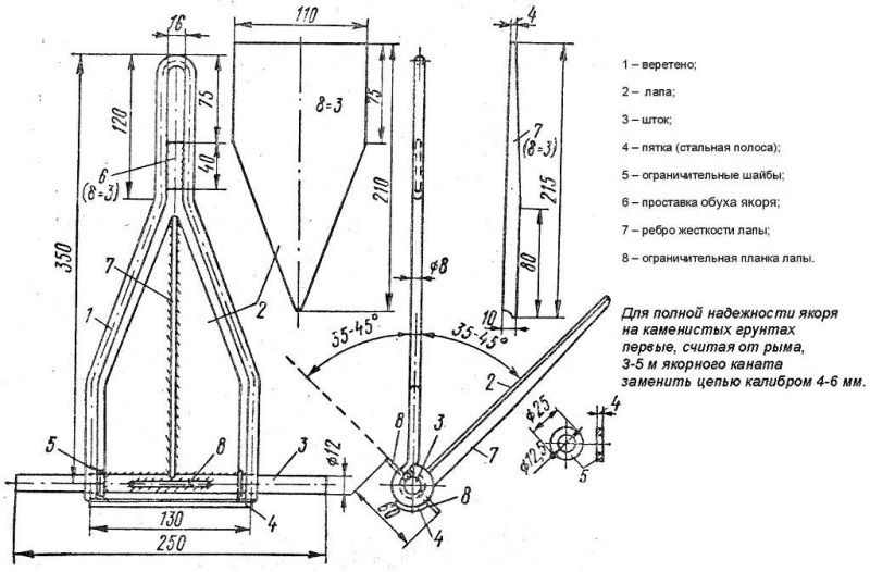 en soudantmétal. De plus, ces méthodes peuvent être combinées entre elles. Dans la plupart des cas, les pêcheurs font exactement cela : ils jettent séparément toutes les grandes parties de l’ancre : le fuseau, les pattes et la crosse. Ensuite, les pattes sont soudées avec une broche, puis la tige est soudée. Pour plus de solidité, les deux pattes et la broche sont souvent fixées avec une pince, faisant un trou dans chaque partie et y soudant une tige. Dessins d’ancres auto-fabriquées pour bateaux en PVC :